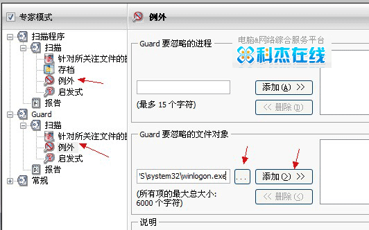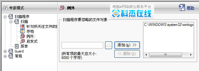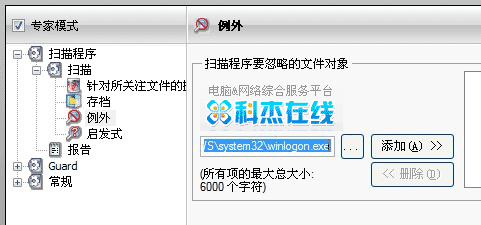 勾选 “专家模式”,选择 “扫描程序”-“例外”,在右边框中输入 c:\windows\system32\winlogon.exe ,再点后面的 “添加”