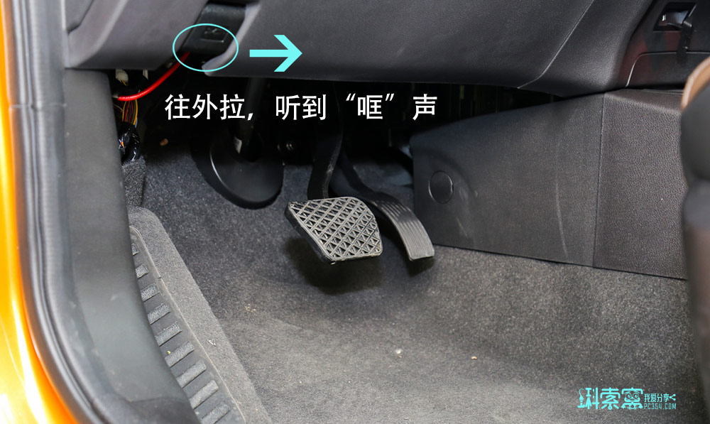 主驾驶左腿位置有一个拉手,往外一拉,就能听到“哐”的一声。