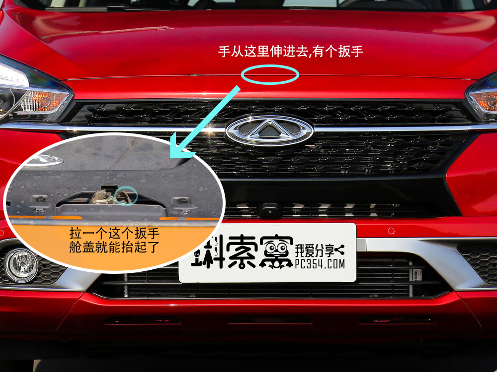 发动机舱盖会打开一条缝,一手抬着翘起的发动机舱盖,另一只手从中间位置伸进去,有个扳手,拉一下,发动机舱盖就能完全打开了,用杆子撑起来。