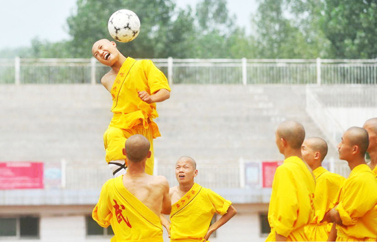 世界杯正如火如荼的在南非进行,广受球迷喜爱的梅西[博客]牵动着中国球迷的心,同时也在中国引起了一股踢足球的热潮。近日在河南登封,少林寺塔沟武校的足球校队也开展了自己的足球课程,足球队全部由塔沟武校的男生组成,最大的19岁,最小的才15岁,结合每个人的专长,来分配场上的11个位置,他们在郑大体院登封校区足球场进行了训练,在绿茵场上,黄色武僧袍,非常养眼。