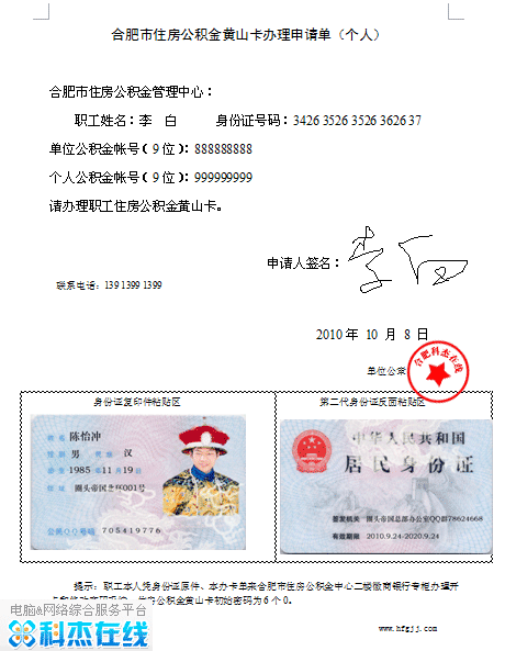 合肥市公积金卡(徽商银行黄山卡)办理方法是:携带本人身份证及复印件+黄山卡个人办理申请表(按下图填写)