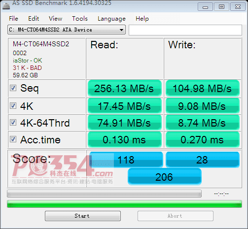 装好系统后用AS SSD软件测试了一下SSD的性能,如下,可以看到4k是没有对齐的(显示为红色BAD),得分如下: