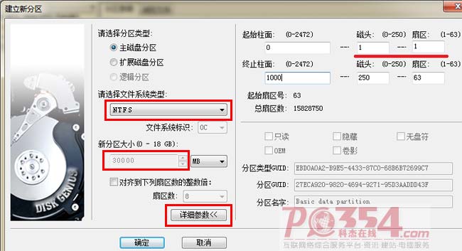 选择“主磁盘分区”,文件系统类型为“NTFS”,新分区大小为30000MB(这只是我电脑上的我准备分的大小,这个数据根据个人需求你自行考虑),然后点击“详细参数”。