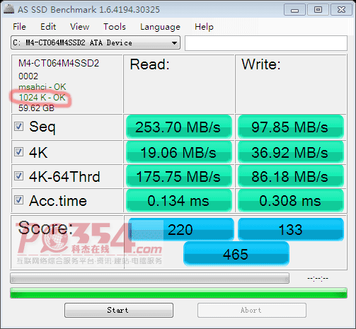 装好系统后再用AS SSD测试一下,4K已经对齐了,性能测试跟未对齐状态还是有点区别的。