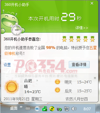 开机速度已经很快了,过了WIN7的启动动画后大概5秒进入桌面,就已经可以正常操作了,原来进入桌面后硬盘还要狂读一会才能操作,360开机助手提示开始用了36秒。